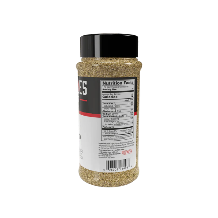 Our Garlic Jalapeño Rub is the best spicy all-purpose rub around! The combination of savory, mouth-watering garlic and peppery, jalapeño heat is perfect for chicken, beef, seafood, and so much more. You can even add this fan favorite to your popcorn to give it a kick. With so much flavor in one rub, it’s no surprise that this is our #1 best seller.Salt, sugar, spices, monosodium glutamate, dehydrated garlic and less than 2% silicon dioxide added to prevent caking.
